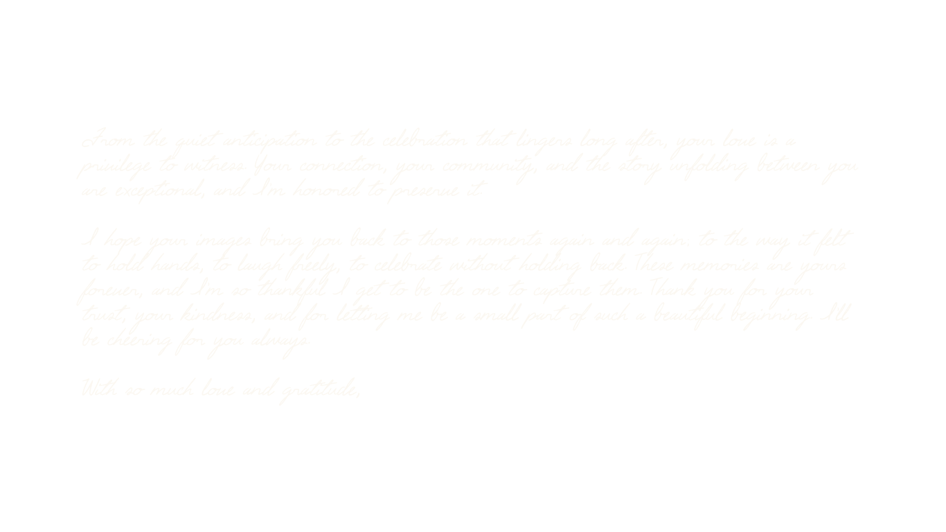 More than anything, I value connection. I believe the best images come from trust, presence, and a shared understanding that your wedding day isn’t something to perform, but something to live. It’s an honor to witness these moments and transform them into lasting heirlooms — images that carry meaning and memory for generations to come.